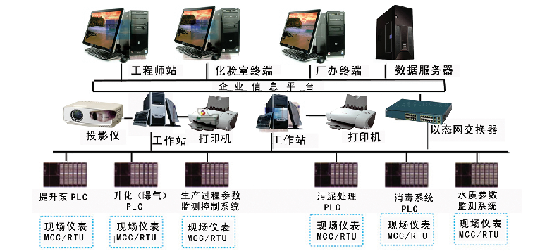 城市污水處理廠自動(dòng)控制系統(tǒng)采用計(jì)算機(jī)十PLC+現(xiàn)場(chǎng)儀表構(gòu)成的分布式控制系統(tǒng)。系統(tǒng)設(shè)置一個(gè)中央控制室PLC站和現(xiàn)場(chǎng)PLC控制站,分為管理層(中控室操作員站)、控制層(PLC控制站)和執(zhí)行層(現(xiàn)場(chǎng)測(cè)量?jī)x表、執(zhí)行機(jī)構(gòu))。中央控制室與現(xiàn)場(chǎng)控制站之間通過工業(yè)以太網(wǎng)(或工業(yè)總線)形式通訊。