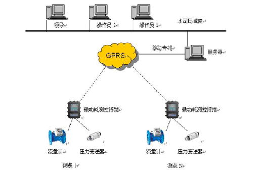自來水廠調(diào)度中心、各職能部門之間數(shù)據(jù)通信在局域網(wǎng)內(nèi)完成;管網(wǎng)測點(diǎn)與自來水廠調(diào)度中心之間采用GPRS無線通信。