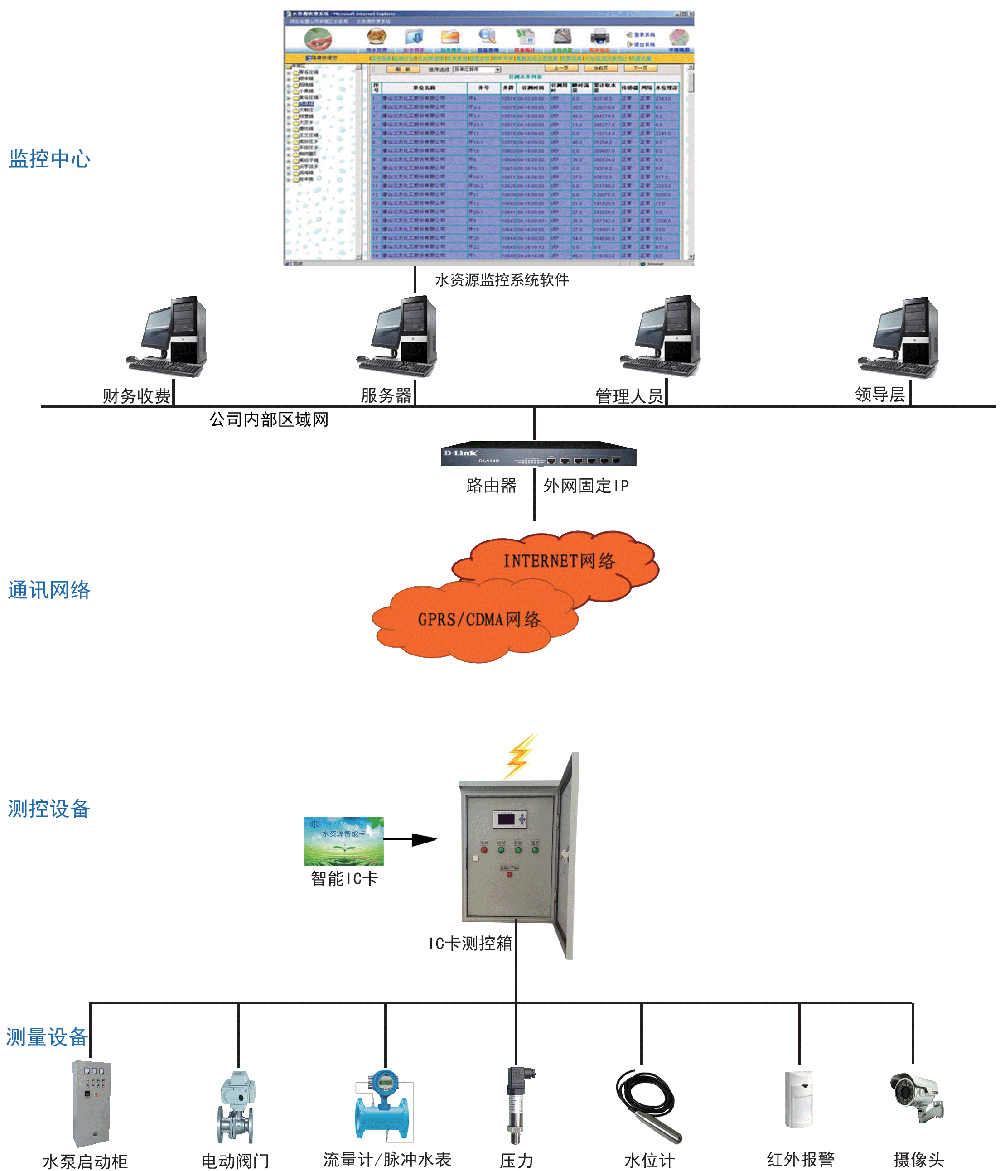 系統(tǒng)簡(jiǎn)介 水資源實(shí)時(shí)遠(yuǎn)程監(jiān)控管理系統(tǒng)是應(yīng)用在水務(wù)部門的一套智能化管理系統(tǒng),它通過對(duì)用水單位的實(shí)時(shí)監(jiān)測(cè)與控制,有效的保護(hù)水資源、合理利用水資源、加強(qiáng)用水單位的節(jié)水意識(shí),是一套在水務(wù)行業(yè)中的理想解決方案。 系統(tǒng)組成 v 中心接收部分:中心服務(wù)器、固定外網(wǎng)IP、水資源管理系統(tǒng)軟件; v 傳輸網(wǎng)絡(luò):移動(dòng)或電信網(wǎng)絡(luò); v 采集控制終端:水文水資源遙測(cè)終端RTU; v 儀表部分:流量計(jì)/積算儀、水位計(jì)、壓力變送器、控制柜/電動(dòng)閥門; v 供電方式:市電、太陽能供電、電池供電。